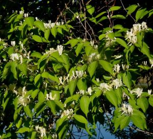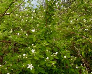 One of the many first blooms of the year on Oakleaf Hydrangea, east of the lake, cold morning, March 17