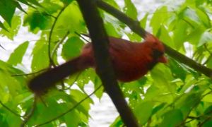 Cardinal male perches in Tulip tree in shadows along the west bank, March 21