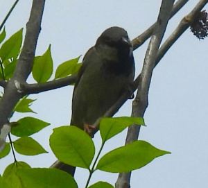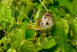 When I watch a House Sparrow fly forty miles an hour into a dense cloud of leaves, then stop fully in a silent instant, then speak in a range of pitches to neighbors, then take off again as part of a perfectly coordinated group, all I can do is marvel in respect. In comparison, it’s all I can do to stay balanced on my painfully slow two legs and maybe, if I’m lucky, snap a photo of one of these birds before they zoom away.
