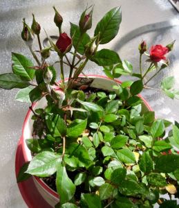 garden dwarf parade red rose buds and blooms late Apr – 1