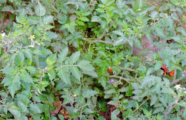 The blueberry mini tomato (below) that I planted in April grew to almost six feet tall and sent shoots out well beyond the cage. This month, I chose to cut down the main stem and just leave the extensive ground cover, which continues to produce fruit and new blooms even as the days shorten.