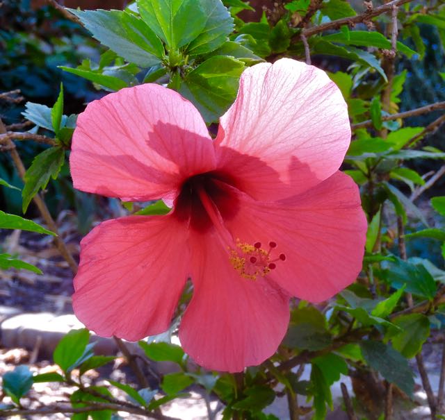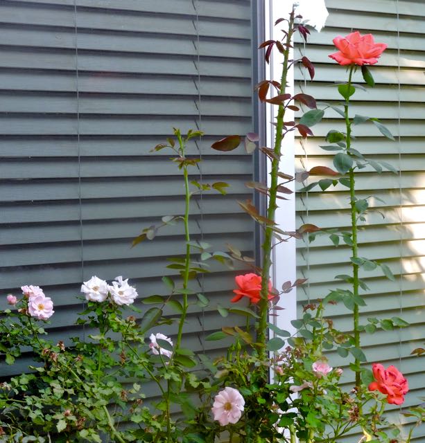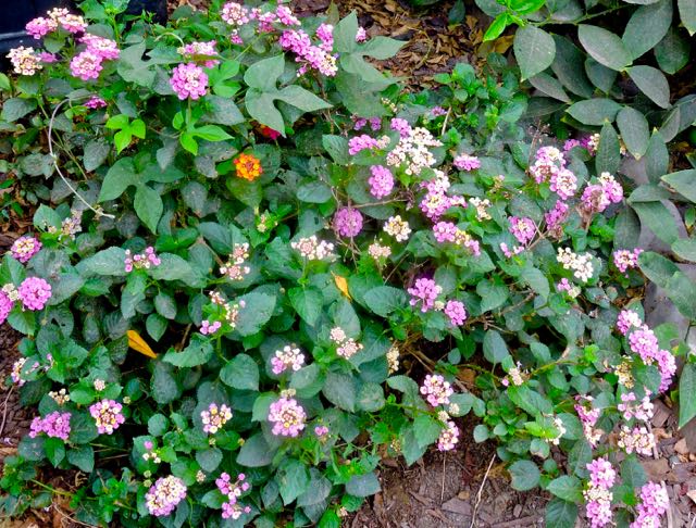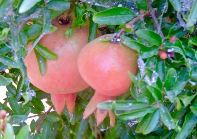 The dwarf pomegranate (below) was self-seeded from one that I was growing in a pot on the verandah. That plant is long gone, but the current one has been growing for four years and is now four feet tall. Its fruit grow larger each year. And even as the fruit ripen in the fall, new blooms keep coming.