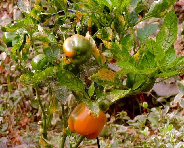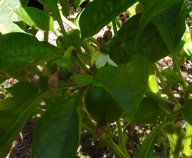 The Carmello tomato I transplanted in June (left) has now in September produced multiple small fruit. Same with the yellow pepper (below) that I transplanted in July from one raised bed, where it got less sun, to the larger bed where it gets full sun.