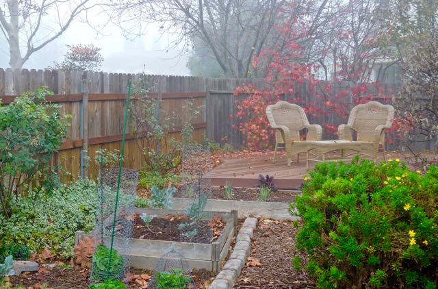 On a foggy late December morning: red beets and green onions in the large raised bed, broccoli in the small raised bed, and lettuce in cages beyond, with oranges (top left corner) and meyer lemons in the background