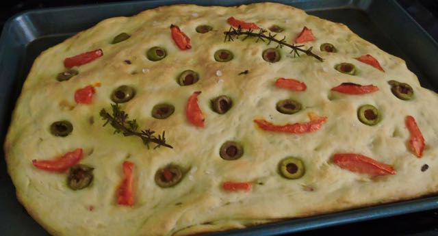 Following that advice and using rosemary from our garden (doesn’t it look like Christmas tree sprigs?), Spanish olives, and sliced tomatoes on top, I came up with a festive looking bread. I was sorry I didn’t have cherry or grape tomatoes. (We’ll have more from our garden next summer!) I only had a vine-ripe tomato, and I saw that Jeff Mauro makes focaccia with very thin round slices of tomato on top.