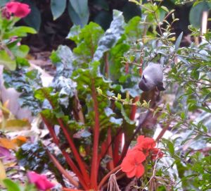 garden back bushtit hanging upside down w chard nov 6 2021 – 1 November 9, 2021November 29, 2021 / Chris Thaiss