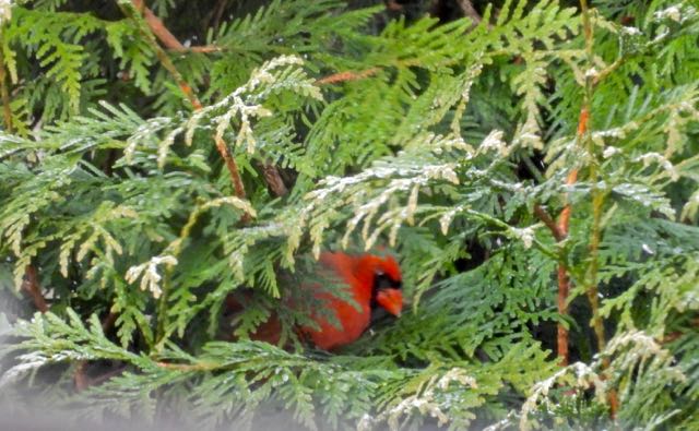 potomac valley male cardinal peeks from greenery at bavarian inn shepherdstown dec 14 2022 – 1 December 27, 2022December 28, 2022 / Chris Thaiss