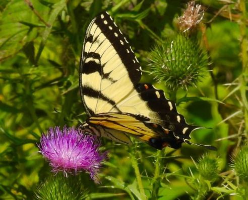 A rare female morph tiger swallowtail and several bumblebees engage the wind as they enjoy purple bull thistles on the north end bank, Sept. 5