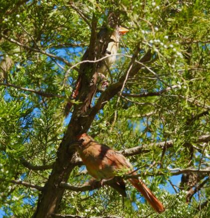 A cardinal couple in a berry-rich juniper tree, southeast bank, Sept. 19