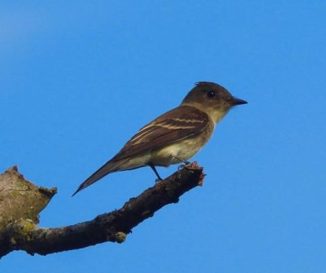 A rarely seen Eastern wood pewee atop a dead tree on the east bank, very hot day, Sept. 4