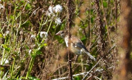 Female blue grosbeak is alert in American burnweed at the north end, Sept. 22