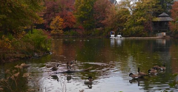 A flock of Canada geese enjoy the southeast cove amid fall colors and the gazebo on the west side, Oct. 29