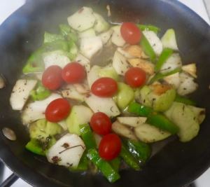 Chris’s Chayote, Green Pepper, Tomato, Garlic Stir Fry