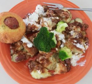Jean’s baked potatoes smothered in chili and cottage cheese, with broccoli and homemade corn muffins, February 12