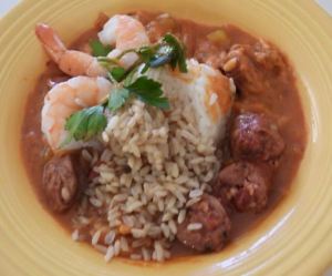 Jean’s Shrimp and Veggie Gumbo, Rice, and Andouille Sausage, February 14