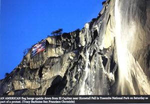 Sign of protest: US flag upside down on the face of El Capitan in Yosemite Park (Tracy Barbutes, SF Chronicle, Feb. 25)