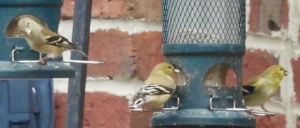 Three American Goldfinches at feeders, Southeast side, February 15
