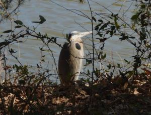 Great Blue Heron, in west bank shadows, braves the cold on February 17. No herons came while the lake was frozen in January.