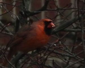 Male Cardinal holding seed in shadow in red maple on the Southeast side, February 15