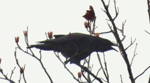 From across the lake I hear this Common Raven calling, atop a Tulip Tree in the East side woods, February 16