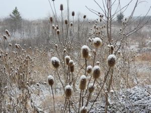 Dry Cutleaf Teazel like ice cream pops by the outlet pond below the north end dam in the snow, February 11