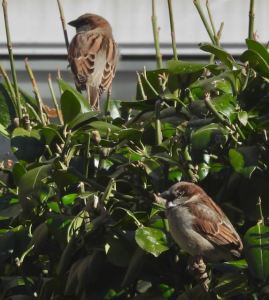 Pair of our abundant House Sparrows in a Japanese Spindle bush by a window in our community, on a cold, windy February 17