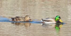 Mallard pair, having returned once the lake unfroze, swims along the north shore on a very cold morning, February 16