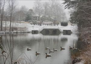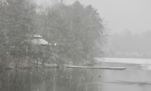 Your classic wintry scene (as if from Currier & Ives): Canada Geese pose in the calm lake before the community park, as the snow gently falls, February 11