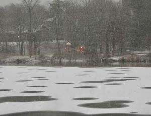 Another change: Panorama toward the north end, with the Geese, the dock, and the gazebo, in the thick snowfall, February 11