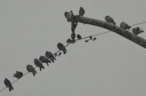 Our resident flock of Rock Doves stays warm amid company on the west side stanchion in thick afternoon snowfall, February 11