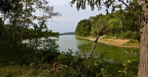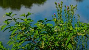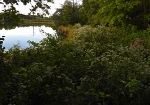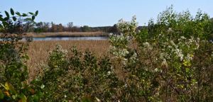 Panorama of Lake Cameron toward north, with Cherry Laurel in foreground, April 20