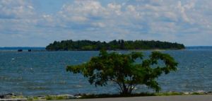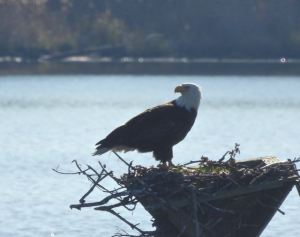Lake Newport: as seen from lakeside path, Red-shouldered Hawk moves up and down chimney after having captured 6-foot snake, apr. 18