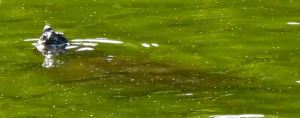 Under water and just after sunrise: 2 large Red-bellied Cooters swim to the northwest shore, April 16
