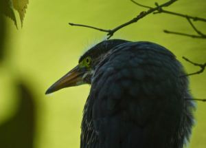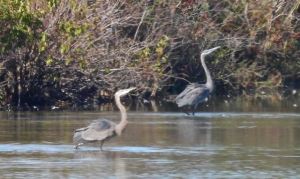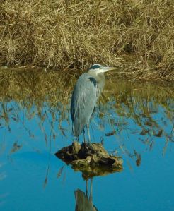 At Lake Newport, Blue Heron and Canada Goose by the dock. Heron takes off and House Sparrows chatter in a nearby nest, April 18