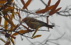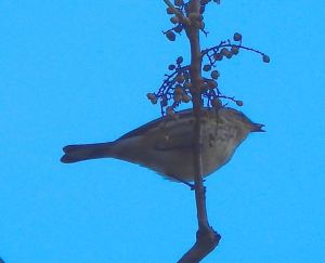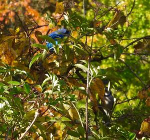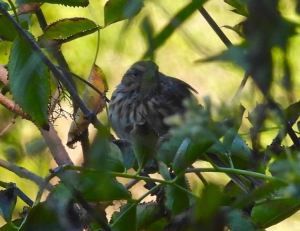 American Goldfinch in morning sun calls from atop a Willow Oak on the east bank of the lake, April 16, while Blue Jay also calls and walkers comment