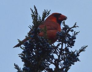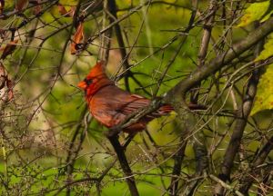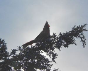 American Robin calls from atop a Walnut tree in the east woods, April 15