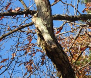 Red-shouldered Hawk atop Tulip Tree north of the dam hears and watches the traffic roar past on the neighboring highway, Feb. 1
