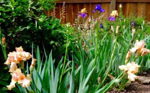 garden back irises lemon bush alum root rosemary 4 13 20 – 1