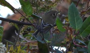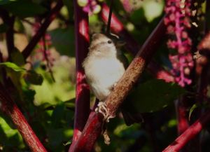 Mockingbird in Red Cedar, northwest corner by the path, with Porcelainberry, July 4