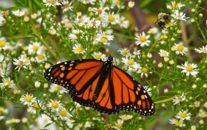 In our garden patch, Monarch feeds on a Garden Cosmos flower, hot morning, July 21