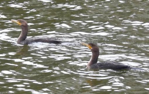 Two Double-crested Cormorants swim mid-lake in the rain, March 2