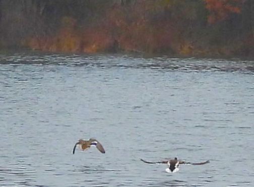 Mallard pair in flight toward the northeast shore in the rain, March 2