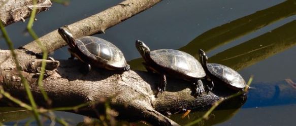 When the high temp gets consistently above 60F, the Red-Bellied Cooters, including these 3 on the west shore, rise from their winter home in the lakebed, March 14
