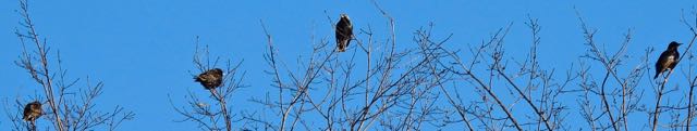 Four starlings converse atop a willow oak, east bank, early morning, March 1