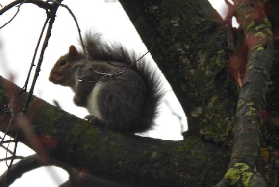 This Grey Squirrel ponders high up in an oak in the southeast woods, rainy March 27