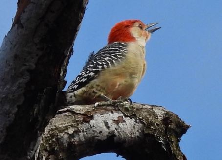 I heard this Red-bellied Woodpecker calling and tapping high on a hundred-foot tall white oak in the thick woods beside the southeast cove, and finally spotted it, on a sunny morning, March 3