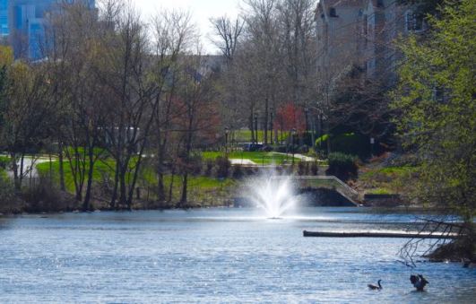 View toward the south end and downtown as 2 Canada geese swim near the west side dock, March 19