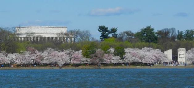 The Tidal Basin Yoshino Cherry Trees, planted 1912, with the Lincoln Memorial and the Martin Luther King, Jr., Memorial beyond the waterside, March 18