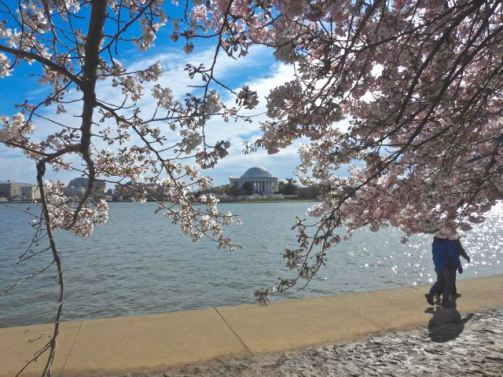 Blooming cherries surround the Jefferson Memorial across the Tidal Basin, March 18