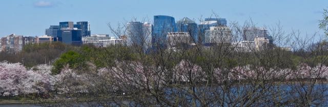 Meanwhile, the broad, deep Potomac River, whose tidal waters fill (and daily overfill) the Basin, rolls on, with the Virginia high-rise city of Roslyn on its west bank. Because much of Washington city, including the Tidal Basin, is built on land reclaimed in the 19th century from Potomac River mudflats, high-rise buildings like those in Roslyn are not allowed east of the river.